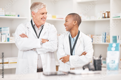 Medical, smile and arms crossed for pharmacy with a team in a drugstore for healthcare or treatment. Medicine, collaboration or teamwork with a man and woman pharmacist happy a dispensary together