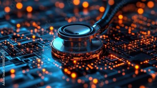 Medical stethoscope on glowing circuit board; examining digital health