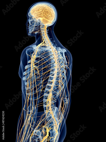 three-dimensional, anatomical, anatomy, artwork, biology, biomedical, blue, body, brain, central, cerebellum, cerebra, graphic, health, human, illustration, medicals, nerve, nervous, on black, rendering, science, spine, system, chested, transparent, vertebra, x-ray, yellow