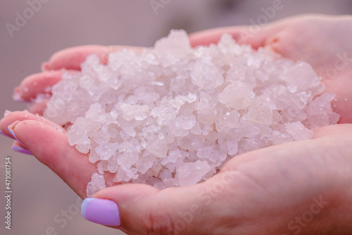 Medicinal salt from a pink lake in the hands of a girl