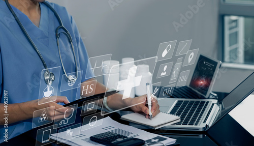 Medicine doctor using digital healthcare and network connection on hologram modern virtual screen interface icons, Medical technology futuristic concept.