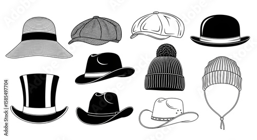hat, headwear, fashion, style, motif, attire, formal, cowboy, type, attaching, clip art, trendy, vignetting, stylish, textile, artwork, ornament, print, indoor, lady, seasonal, festive, silhouette, material, graphic, monochrome, fit, volume, kind, elegant, theme, head, trend, fabric, panama, sombrero, drawing, variety, size, gentleman, outfit, headgear, garment, fashionable, costume, shape, classic, retro