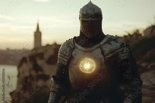 knight, armoring, mediaeval, sunset, city, landscape, historical, warrior, soldier, battle, hero, fantasy, mythology, legend, ancient, power, strength, courage, protection, security, dawn, twilight, silhouette, cliff, ocean, coast, horizon, epic, dramatic, intense, mystery, dark, light, glow