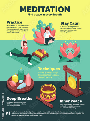 infographic, meditation, mindfulness, breathing, lotus flower, chiming, candle, crystal, wellness, relaxation, inner peace, zen, sharpened, self-improvement, educational, harmony, balance