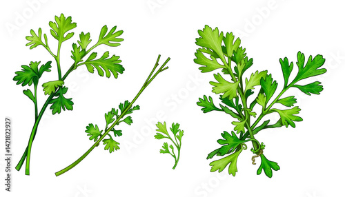 Mediterranean herbs and spices: set of fresh, healthy parsley leaves, twigs, and a small bunch isolated over a transparent background, cooking, food or diet design elements, PNG, crayon drawing. Whi
