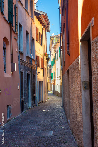Mediterranean town alley in the city of Udine, Italy, displaying vibrant facades on both sides, adorned with wooden shutters and cobblestone paving, evoking a tranquil and picturesque atmosphere.