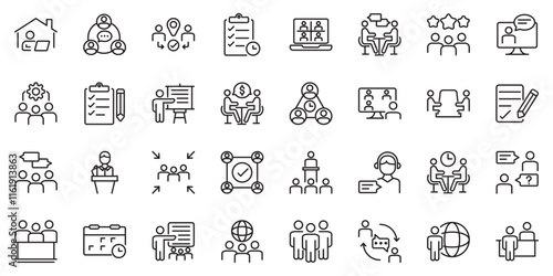 Meeting set of web icons in line style. Live webinar icons for web and mobile app. Containing conference, business meeting, classroom, team, interview, conference, work