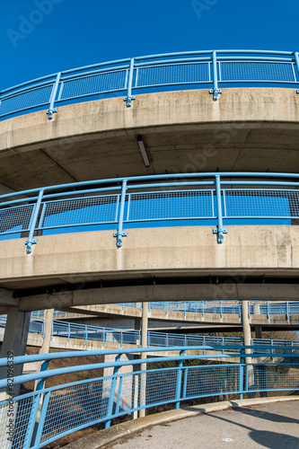 architecture, get away, building, building, concrete, blue, bridge, bridge, emergency exit, footbridge, footway, sidewalk, rail, heaven, high, height, infrastructure, construction, round, round, spiral, city, urban, symbol, symbolic, staircase, detour, urban, connection, communication, crossover, security, road safety, structural engineering, binding, bike path
