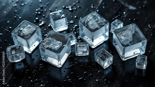 Melting ice cubes with water droplets on a black marble surface with reflections