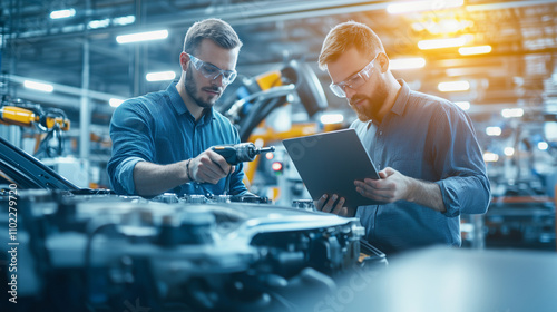 assembly line, teamwork, technology, machine-building, machinery, innovation, workshop, quality control, advanced technology