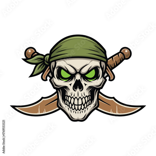 Menacing pirate skull with glowing green eyes and crossed swords emblem artwork