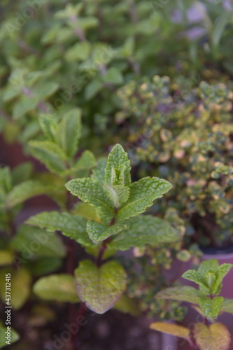 Mentha x piperita perennial, lemon thyme, oregano, marjoram - fresh aromatic and medicinal garden plants