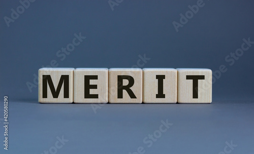 Merit symbol. Wooden cubes with the word 'merit'. Beautiful grey background, copy space. Business and merit concept.