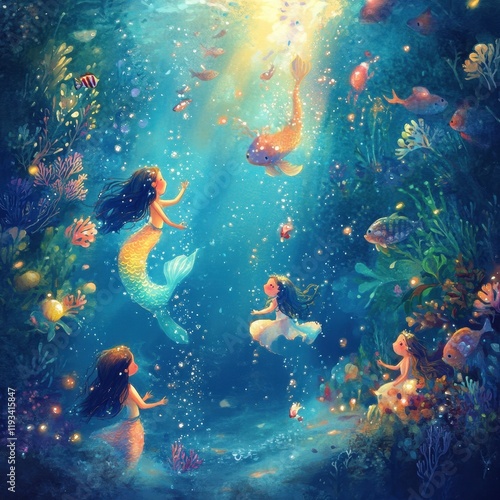 fish, ocean, underwater, sea, coral, bubble, girl, magic, fantasy, aquatic, marin, life, water, scene, painting, illustration, art, colourful, vibrant, beauty, serene, peaceful, mystical, dreamlike, enchanting, playful, joyful, light, glow, sparkle, shimmer, goldfish, seaweed, plant, reef, kelp, creature, deep, dark, bright, happiness, wonder, aethereal, glowing