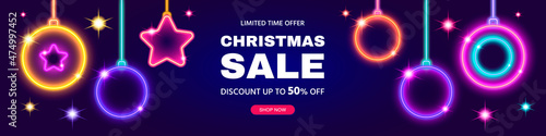 Merry Christmas discount sale banner. Modern design aesthetic geometric shapes of Christmas balls and decorations in neon style. Abstract background with glow. Template vector illustration.