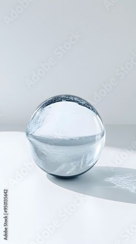 Mesmerizing Floating Glass Orb with Surreal Reflections and Refractions in Minimal Blue and Gray Tones