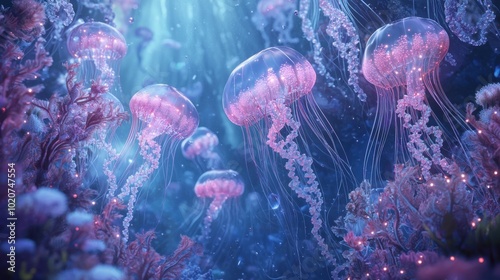 Mesmerizing Underwater Jellyfish Swarm in a Glowing Ethereal Marine Ecosystem