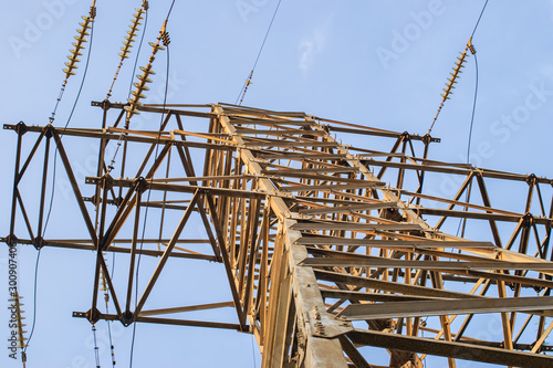 metal carcass of power electric transmission lines with wires insulators and wires at electrical substation with transformers