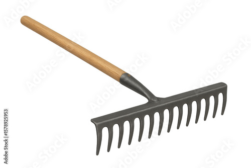 Metal garden rake with wooden handle isolated on transparent background, ideal for collecting leaves and debris