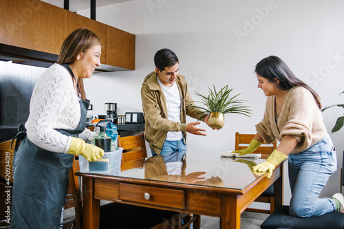 mexican Family mother, son and daughter cleaning kitchen at home in Mexico city