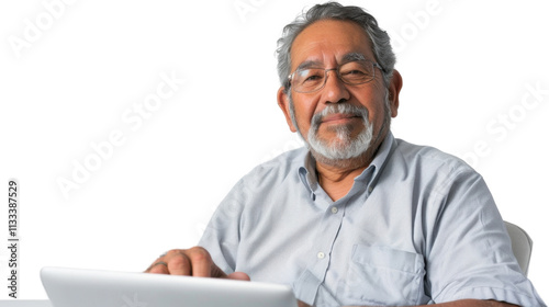 Mexican middle age male Employee IT specialist sit at work with laptop on white background
