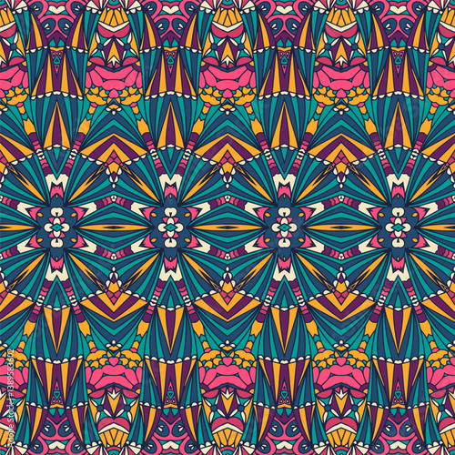 Mexican psychedelic Vibrant motif background. Vector seamless pattern ethnic boho art pattern design with vivid colors ornament.