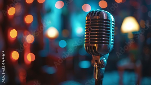 Microphone for live karaoke, concerts or stand-ups - retro microphone with a defocused abstract background