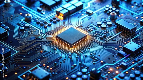 Microscopic view of intricate electronic circuits and tiny chipset components, showcasing complex pathways and minuscule details, with a shallow depth of field and blue tone.