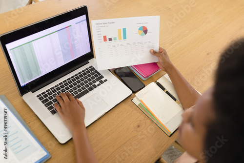 Mid adult african american female freelancer using laptop and examining chart at desk