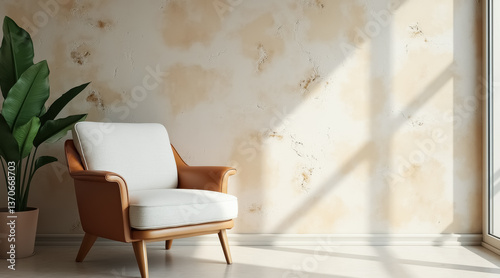 armchair, mid, century, modern, upholstery, leather, beige, wall, textured, sunlight, plant, green, pot, calm, inviting, furniture, interior, home, decor, style, room, comfortable, relaxing, peaceful, serene, tranquil, aesthetic, minimalist, sophisticated, elegant, stylish, cosy, warm, natural, light, shadow, texture, vintage, retro, classic, apartment, house, living