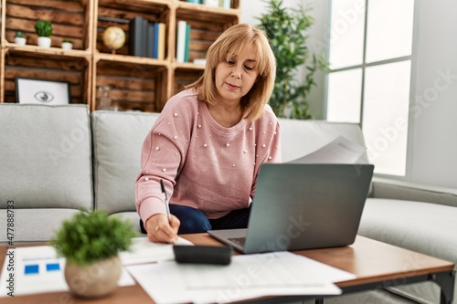 Middle age blonde woman concentrated teleworking sitting on the sofa at home.