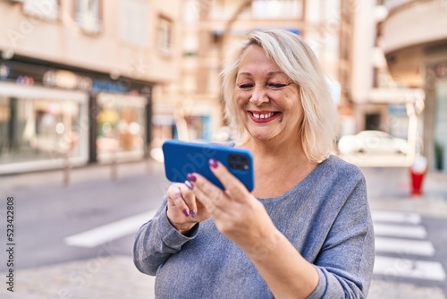 Middle age blonde woman smiling confident using smartphone at street
