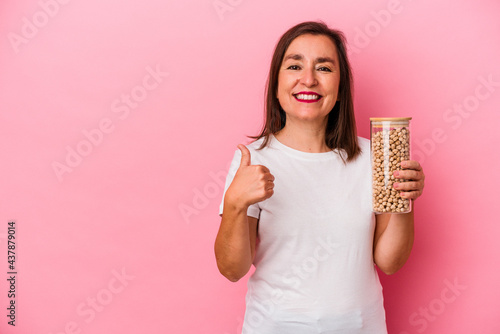 Middle age caucasian man holding a chickpeas jar isolated on pink background smiling and raising thumb up