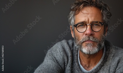 middle-aged, sad, caucasian, man, isolated, grey, background, copy space, portrait, depressed, pensive, sombre, moody, contemplative, alone, solitary, emotional, serious, expression, downcast, melancholic, thoughtful, blank, plain, neutral, empty, sorrowful, mature, individual, reflective