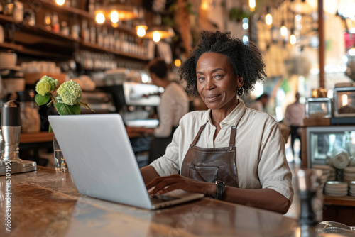 Middle aged black woman owner of small business coffee shop. Mature female using laptop to make order for her cafe