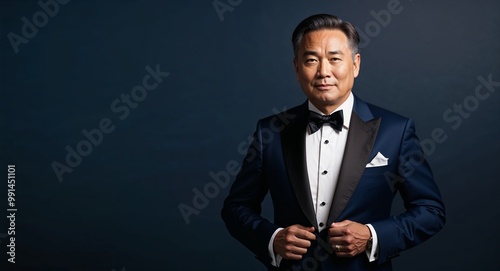 Middleaged Asian man in a luxury tuxedo striking a confident pose against a deep navy background