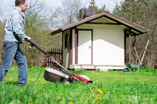 Middle-aged caucasian man cutting grass using an electric lawn mower on the backyard of his country house in springtime