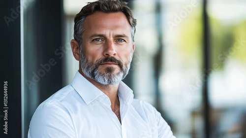 man, business, photogenic, shirt, white, professional, middle-aged, success, confident, executive, corporate, portrait, formal, attire, mature, male, person, leader, smiling, entrepreneur, caucasian, grey, background, isolated, studio, style, ceo, marketing, finance, manager, serious