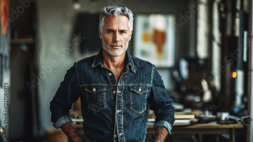 Middle-aged man showcases sustainable fashion practices in urban workshop focused on eco-friendly denim creation
