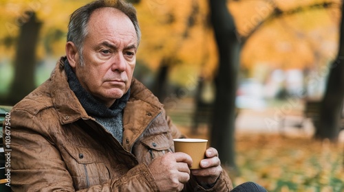 disease, quaking, middle-aged, man, hand, hot drink, cup, park, bench, calm, struggle, shaking, health, condition, disorder, symptom, movement, disability, ageing, elderly, senior, patient, therapy, treatment, medicals, care, support, assistance, daily, life, challenge, coping, resilience, strength, determination, hope, optimism, wellness, environment, peaceful, serene, quiet