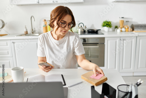 woman, middle-aged, caucasian, beautiful, home, sitting, kitchen table, phone, technology, browsing, scrolling, communication, cyberspace, connection, indoor, absorbed, concentrated, thoughtful, contemplative, alone, pondering, pensive, contemplation, distraction, leisure time, domestic life, casual attire, brunette, character, portrait, lifestyle, smartphone, key