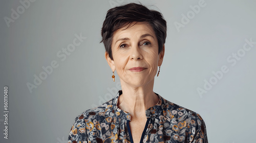 portrait, middle-aged, woman, short, hair, patterned, blouse, simple, white, background, female, 1, person, stylish, confident, casual attire, modern, mature, fashion, adult, cheerful, friendly, happy, isolated, clean, elegant, expression, professional, standing, attractive, smiling, face, natural, looking, poise