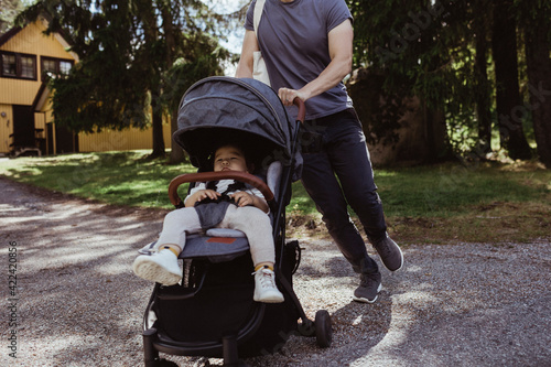 Midsection of father walking with male toddler in baby carriage on road