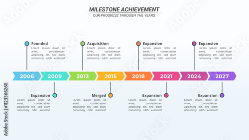 infographic, arrow, timeline, editable, milestone, accomplishment, company, corporate, journey, history, year, month, marketing, info, information, planning, progress, process, workflow, flow, chart, project, strategy, development, success, connection, business, colourful, 8, 8, option, step, stage, text, choice, horizontal, graphic, resource, element, vector, illustration, presentation, layout, template, label, design