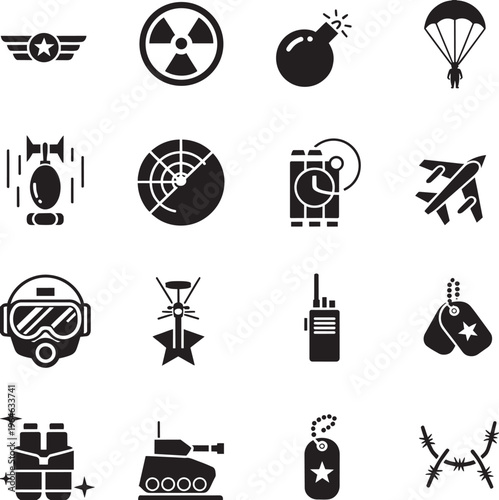 military, army, icon, war, vector, weapon, combat, tactical, equipment, set, symbol, soldier, radar, bomb, dynamite, gas-mask, radio, tank, parachute, nuclear, radiation, binocular, barbed wire, defense, battlefield, mission, force, graphic, design, flat, isolated, black, silhouette, collection, web icon, app, security, danger, explosive, infantry, airforce, armoring, munition, hardware