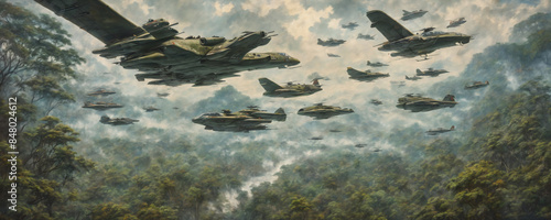 military, flying, 1960s, forest, jungle, invasion, war, background, wallpaper, attack, attacking, sky, oil painting