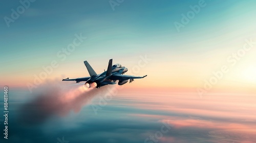 Military jet breaking the sound barrier, leaving a visible sonic boom in its wake, realistic photo, high detail, powerful action, clear skies