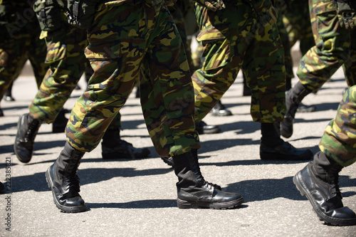 Military marching in a street. Legs and shoes in line