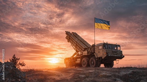 military, vehicle, missile, launch, sunset, ukraine, flag, strength, resilience, landscape, equipment, defense, artillery, sky, cloud, horizon, nature, silhouette, power, armed forces, patriotism, evening, battle, ground, force, tactical, warfare, combat, protection, security, strategy, training, operation, readiness, conflict, modern, technology, symbol, coordination, oneness, territory, peace
