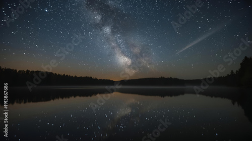 Milky Way galaxy over calm lake at night with shooting star and perfect water reflection